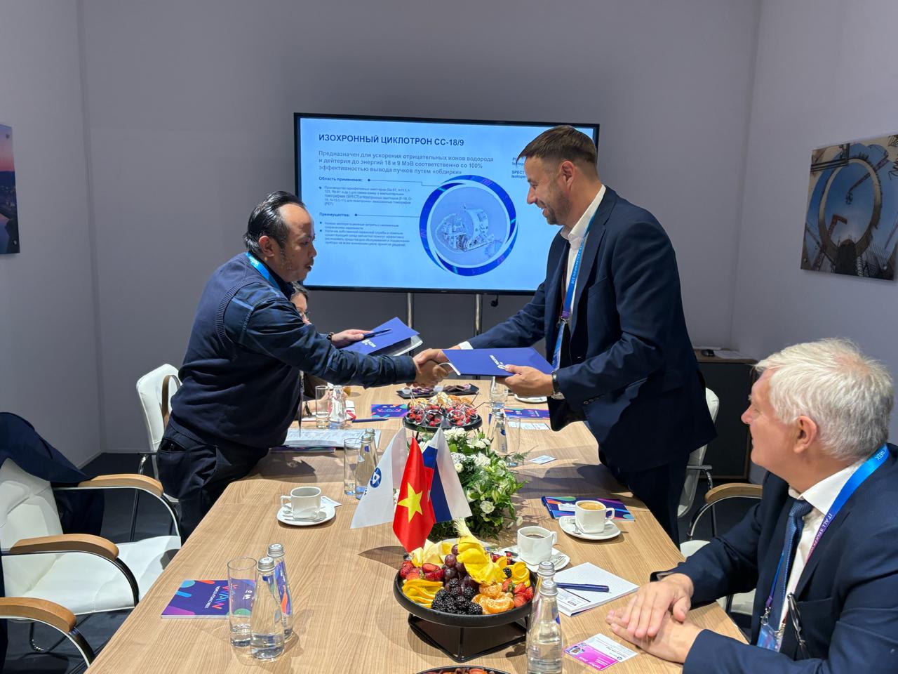 Одной из важных стала встреча с заместителем генерального директора АО «НГС Телекоммуникации и оборудование» (Вьетнам) Тран Куанг Минем. Стороны достигли договоренности о развитии сотрудничества в области поставок оборудования для ядерной медицины, в частности, циклотронных установок. АО «Росатом РДС» готово предложить партнерам комплексные решения, включающие не только поставку оборудования, но и обучение персонала, техническое сопровождение и сервисную поддержку на всех этапах эксплуатации.